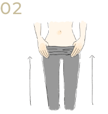 前後を持ち、ウエストまで引き上げます。股部までしっかり引き上げて履くと動いても下がってきません。
