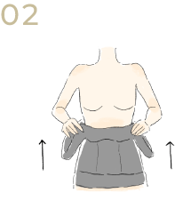 製品に両足を通し、足先からアンダーバストまで引き上げます。