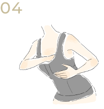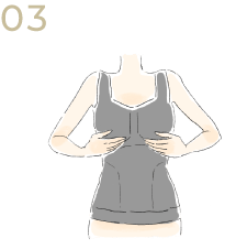 前かがみの姿勢で、背中・アンダー下のお肉、バスト全体を優しく持ち上げ、カップ内におさめて完成です。