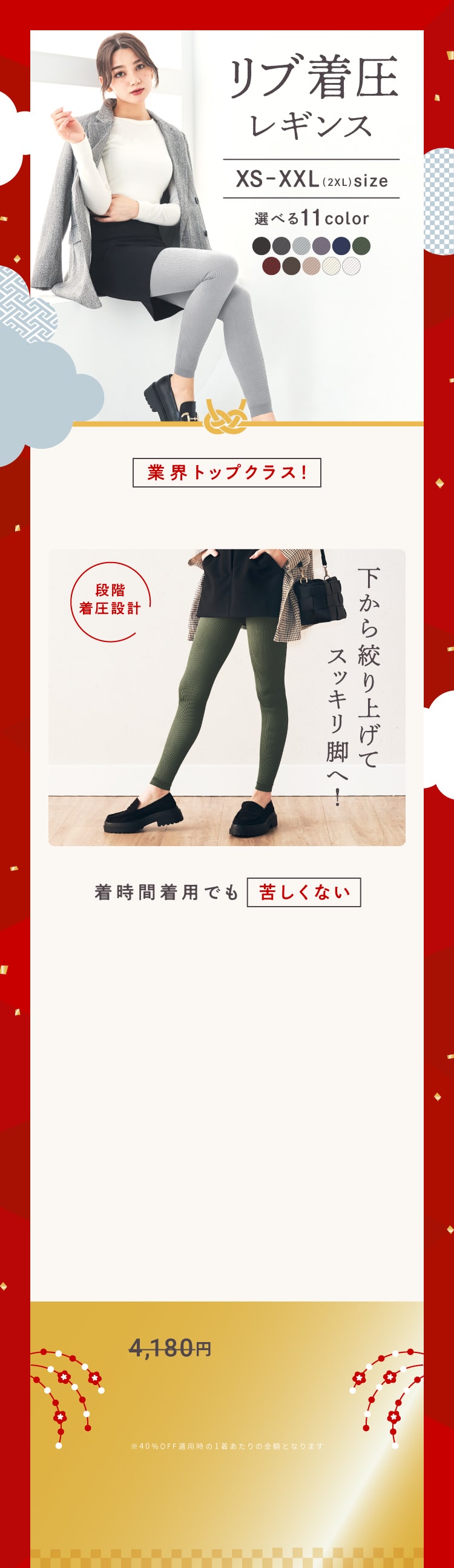 カラーバリエーションが豊富なリブタイプの着圧レギンス。