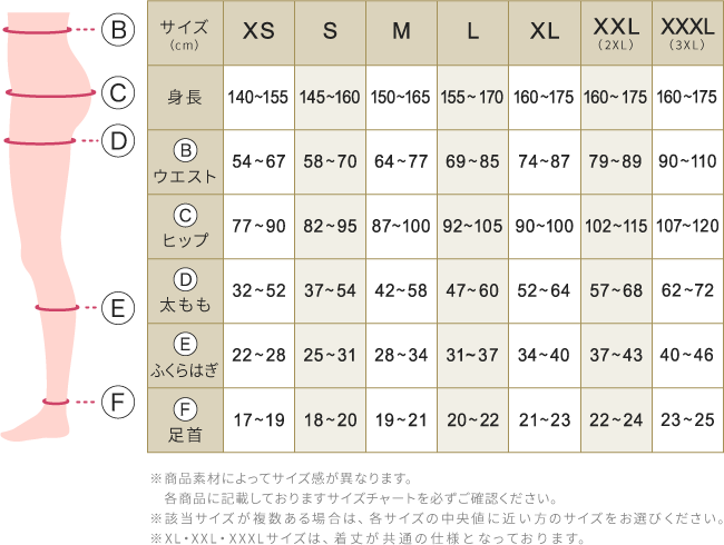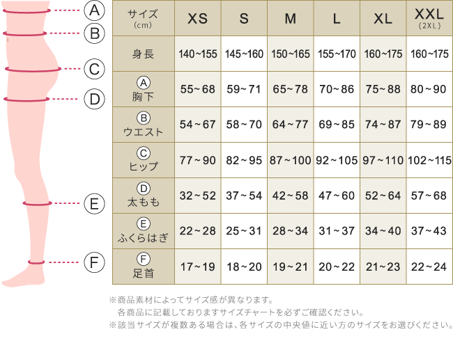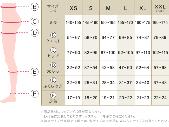 長時間の着用を可能にするため、ウエスト周りの着圧は他の部位と比べると弱めの設計になっています。複数サイズに当てはまり迷ってしまったときは、【太もも】のサイズを優先していただくことをオススメいたします!