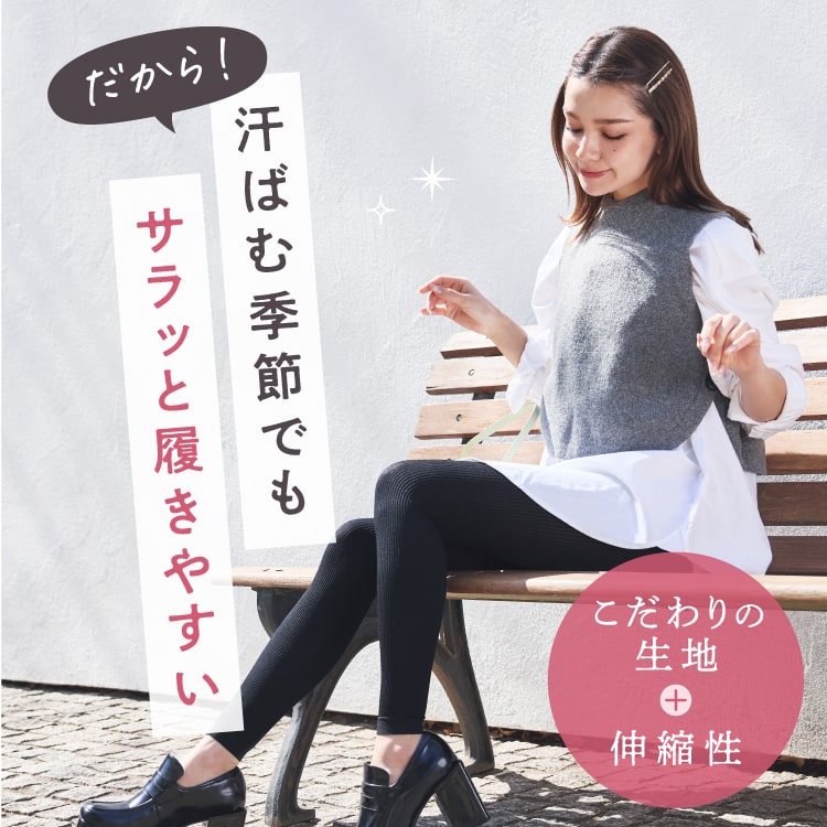 リブ着圧レギンス クールタイプは通気性に優れた生地に抗菌防臭加工を施しているので、汗ばみやすい季節でも心地よく着用できます。また寒い季節やエアコンが気になる季節にも冷え防止として下半身を温められて安心です。