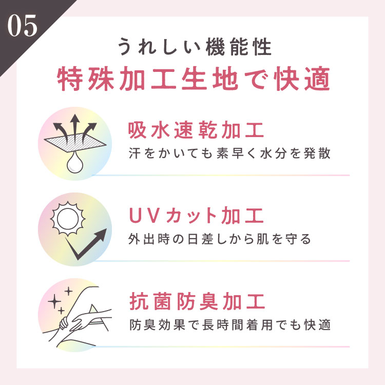 プレーン着圧レギンス クールタイプは通気性に優れた生地に抗菌防臭加工を施しているので、汗ばみやすい季節でも心地よく着用できます。また寒い季節やエアコンが気になる季節にも冷え防止として下半身を温められて安心です。