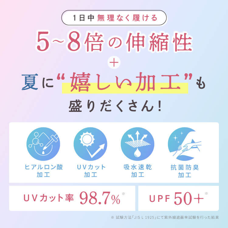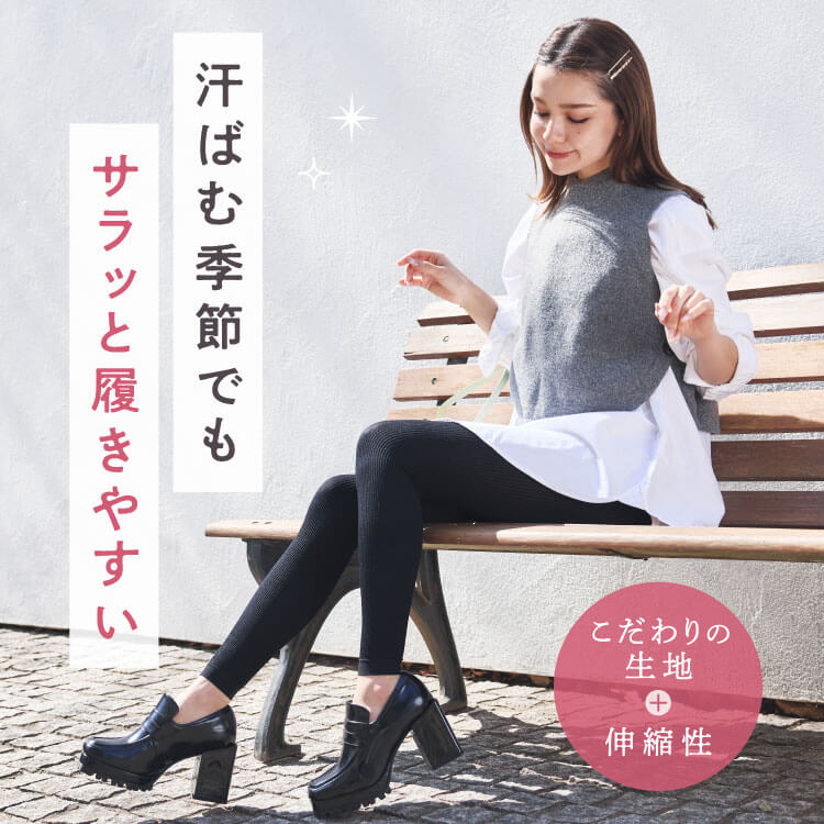 リブ着圧レギンス クールタイプは通気性に優れた生地に抗菌防臭加工を施しているので、汗ばみやすい季節でも心地よく着用できます。また寒い季節やエアコンが気になる季節にも冷え防止として下半身を温められて安心です。