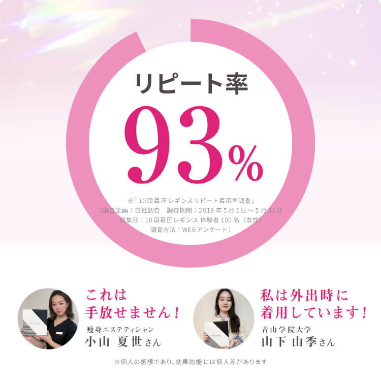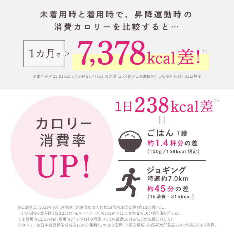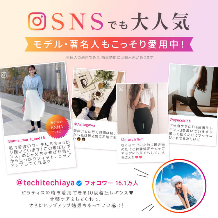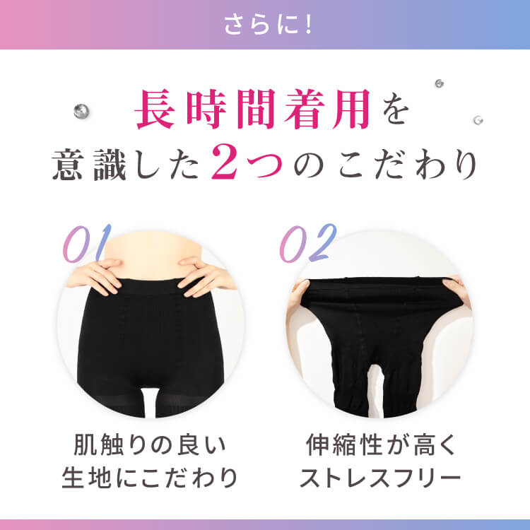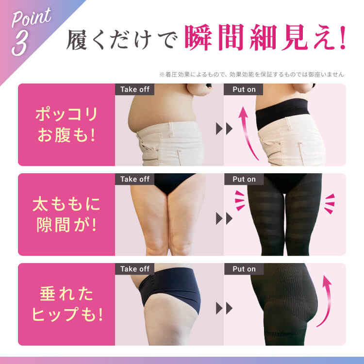 個人差はありますが、履いた瞬間にスリムな見た目をご実感いただけます。また、適度な運動を組み合わせていただくことで脚痩せのお声もいただいております。