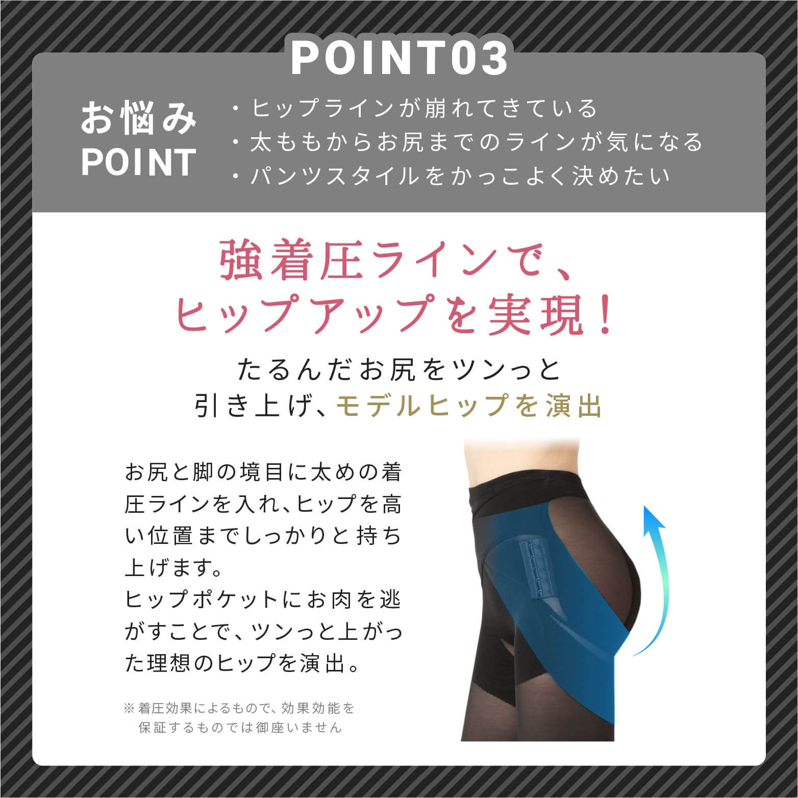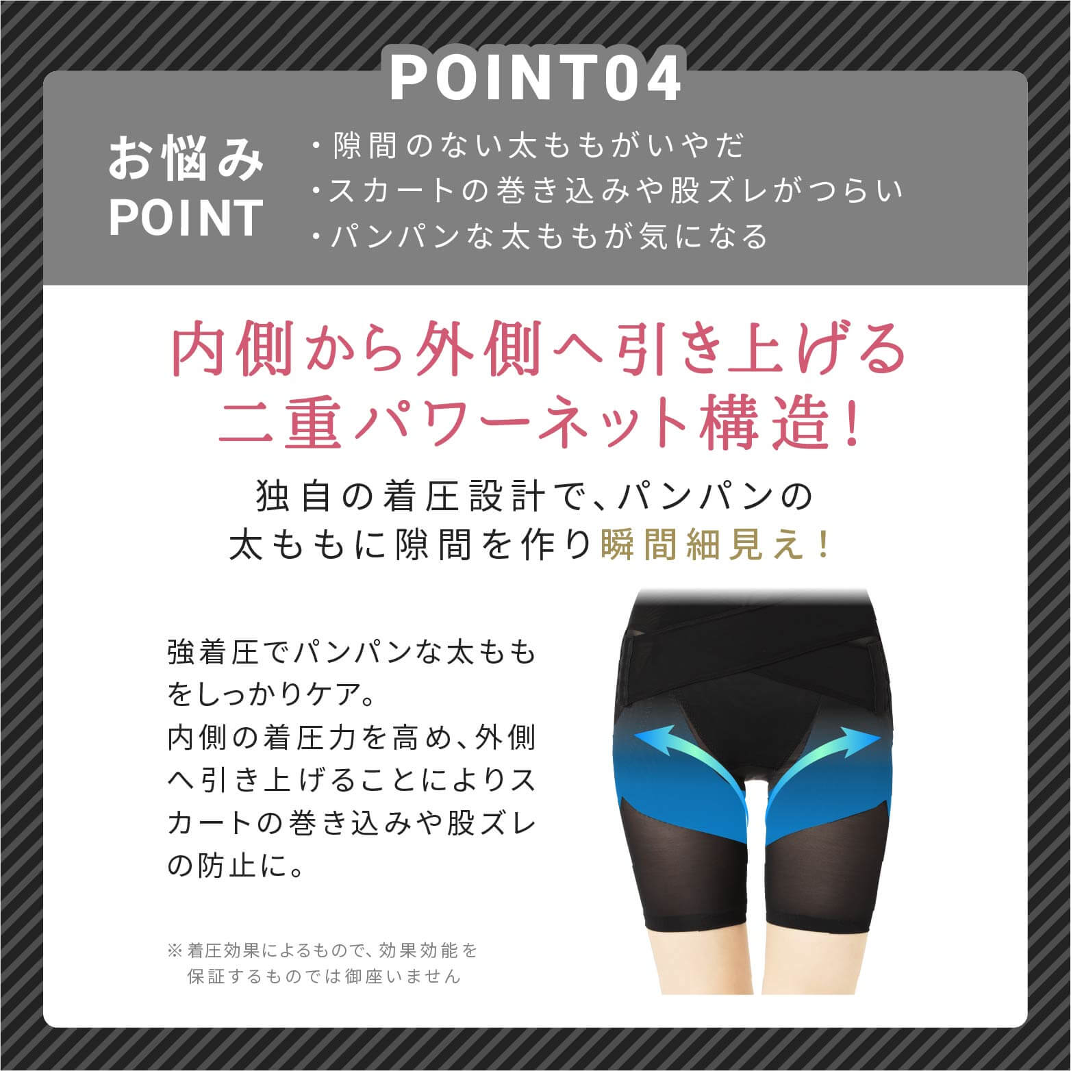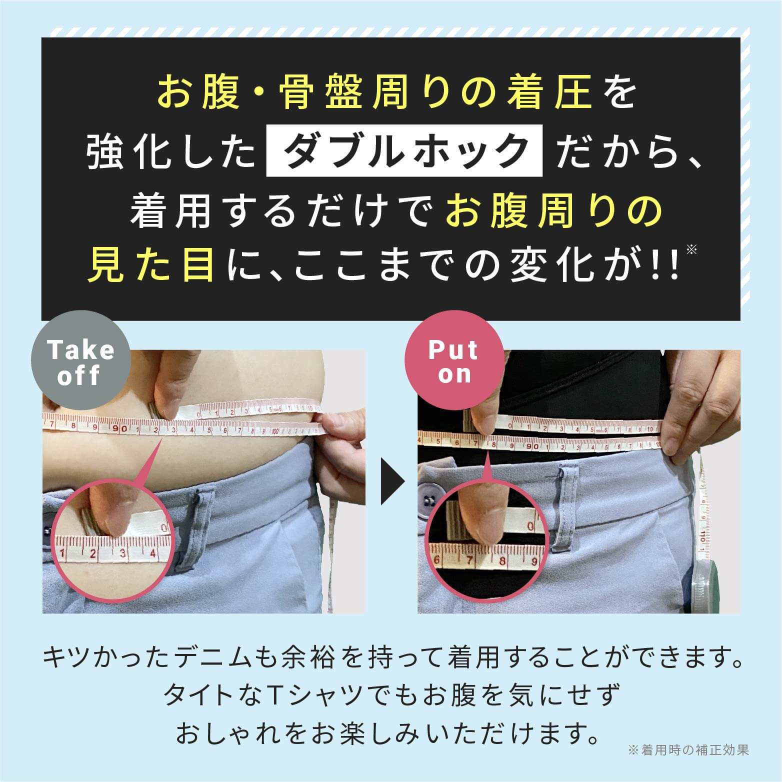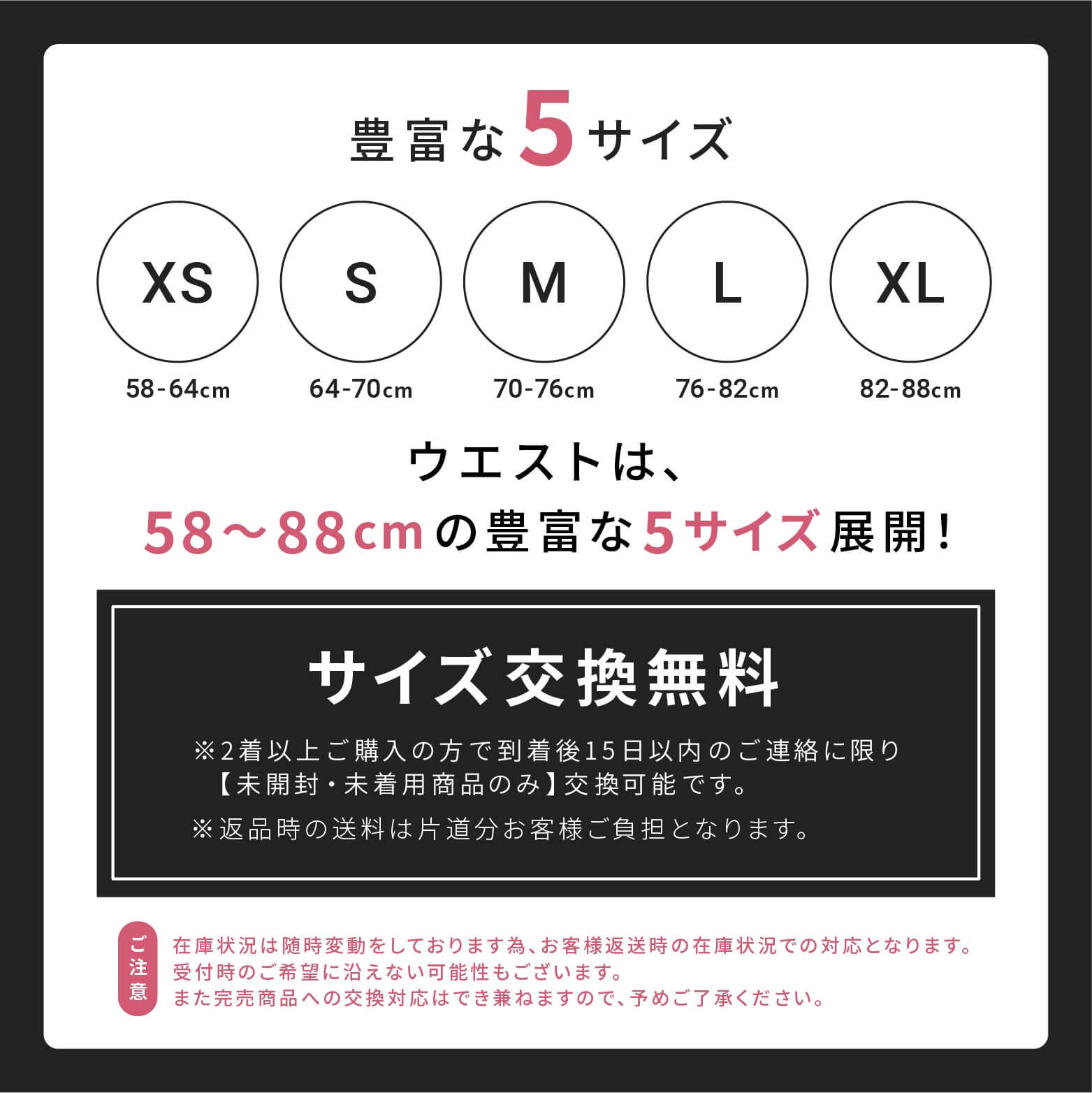 ヒップアップ、ぽっこりお腹、太もも、骨盤周りを中心に着衣部全体をサポートします。着圧効果により「ウエスト」「太もも」「ヒップ」をスッキリシルエットに見せることができます。