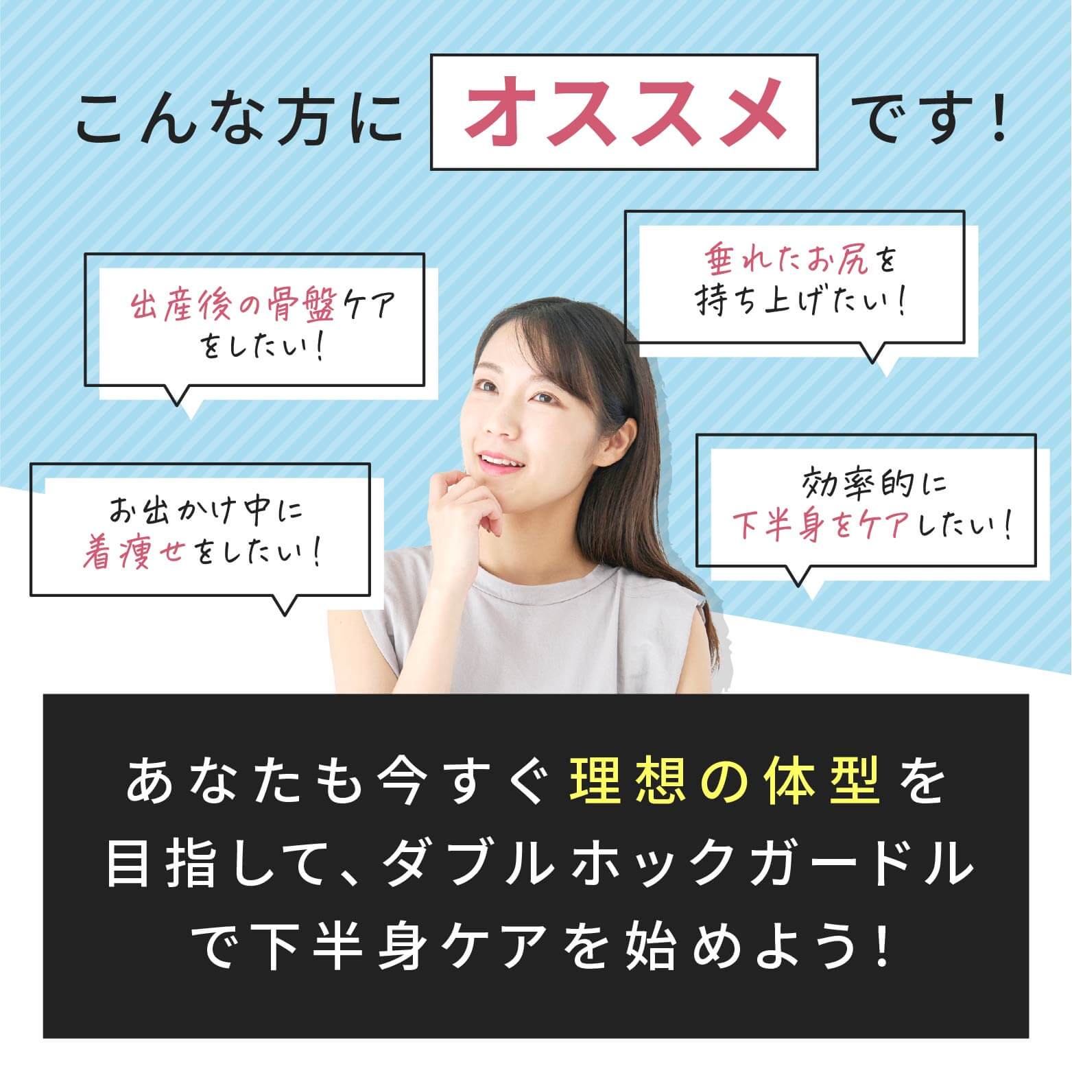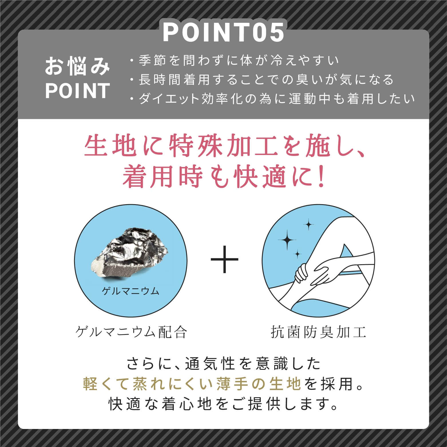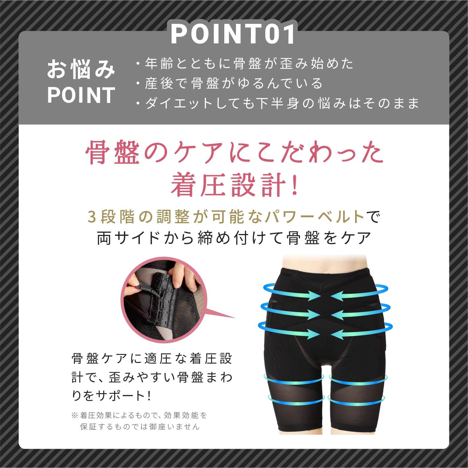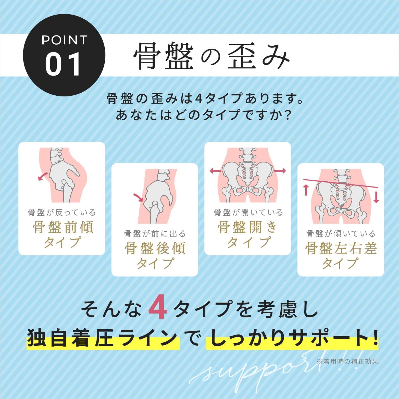 ヒップアップ、ぽっこりお腹、太もも、骨盤周りを中心に着衣部全体をサポートします。着圧効果により「ウエスト」「太もも」「ヒップ」をスッキリシルエットに見せることができます。