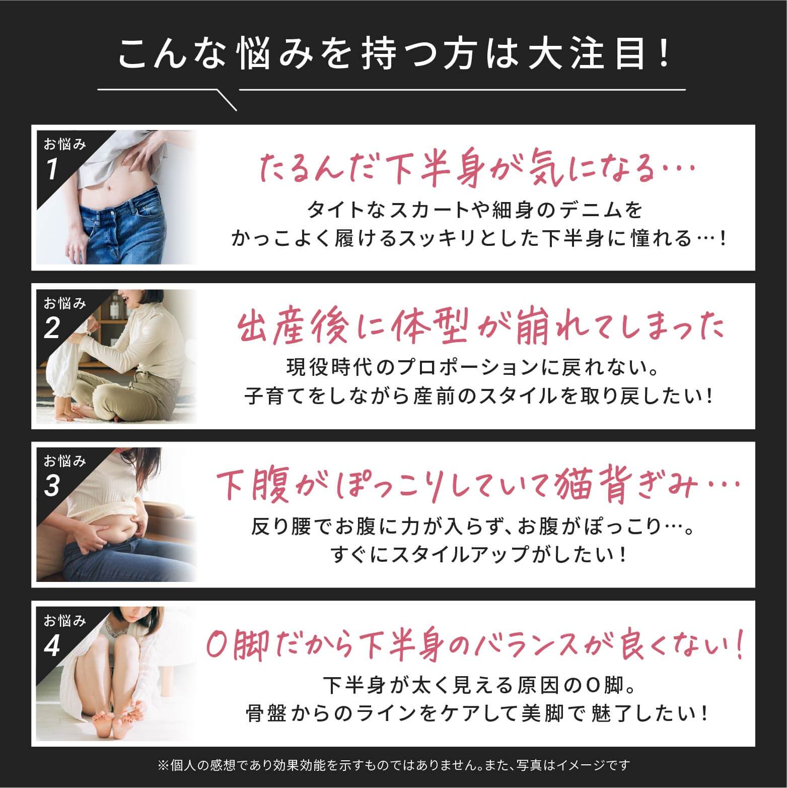 日常生活から影響されやすい場所でもあり、ぽっこりお腹などウエスト周りのお悩みの多くは骨盤をケアすることでサポートできます。